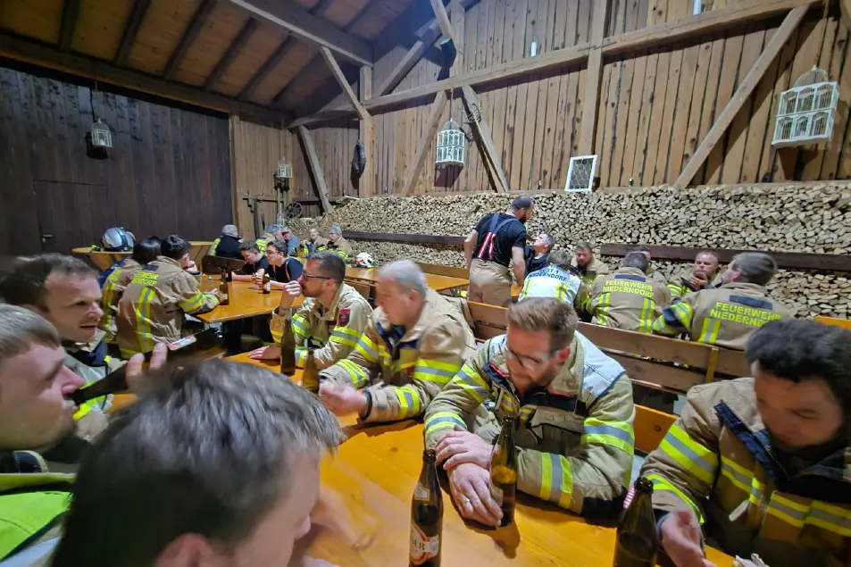 Danach nutzen wir den vorhandenen Heukran und die Kranschienen noch um unser Rollgliss zu beüben, bevor wir dann von den Hausherren noch auf einen warmen Leberkas und einige kühle Bier in den Dehn eingeladen wurden. Wir möchten uns vielmals für die zur Verfügung Stellung des Objektes und die super Brotzeit bedanken, hat uns riesig gefreut.
