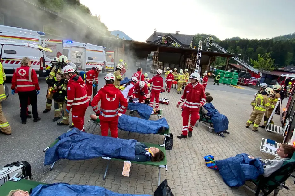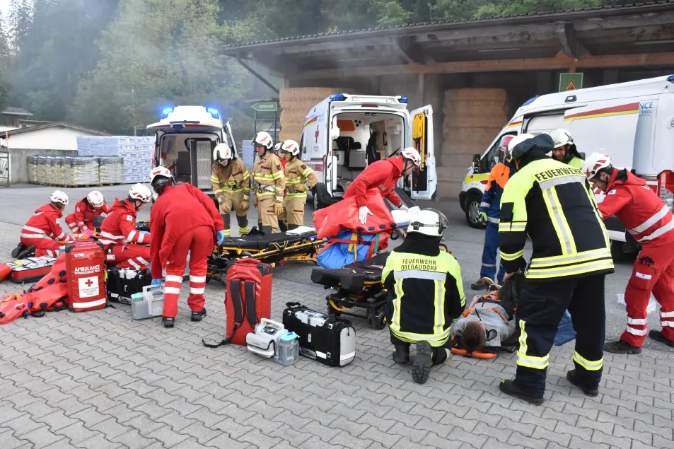Zusätzlich zu den alarmierten Feuerwehren unterstützte uns das Rote Kreuz Kufstein mit mehreren Fahrzeugen und Einsatzkräften bei allen Szeanrien. Ebenso wurde un umfassender Patientenversorungsplatz aufgebaut, in welchem die Patienten nach Ihren Verletzungen beurteilt und anschließend in die Krankenhäuser aufgeteilt werden.