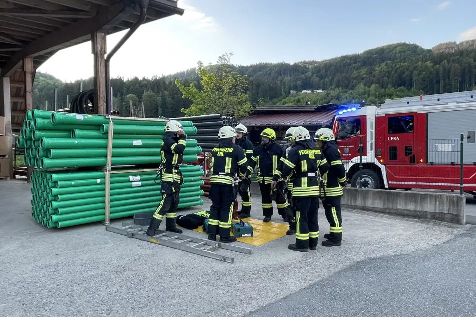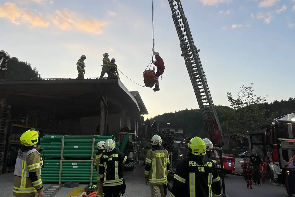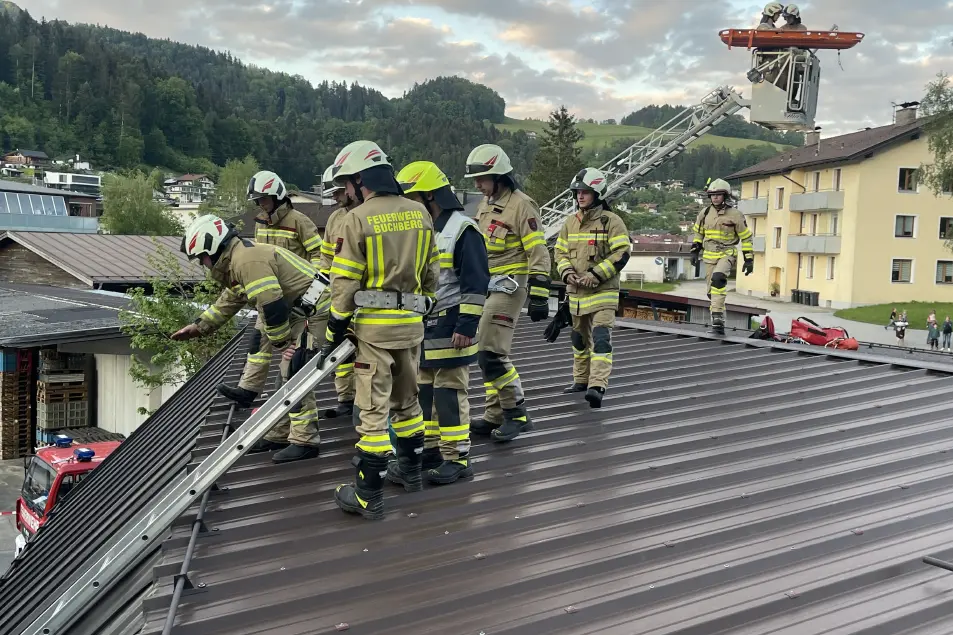 Im zweiten Einsatzabschnitt wurden zwei Verletzte Personen (ein Person gepfählt durch eine Eisenstange und eine Person mit tiefer Schnittwunde) angenommen. Die Personen waren schwer zugänglich und es musste ein Zugang über das Gebäudedach hergestellt werden. Sodass die Erst- und weitere Versorgung der Patienten durch das Rote Kreuz Kufstein erfolgen konnte. Die Kameraden der Feuerwehr Buchberg und Feuerwehr Erl stellten über das Dach einen Zugang zur Person her und bargen beide Personen dann mit Unterstützung der Drehleiter der Feuerwehr Walchsee.