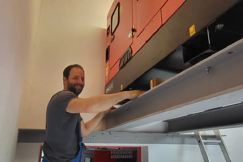 In Niederndorf ist des aber unser Kamerad Roland Speiser mit seinem Unternehmen Mühlbacher Fahrzeugbau, welche solche Kunststücke vollbringen und unsere neue Notstromversorgung in luftiger Höhe schweben lassen.
